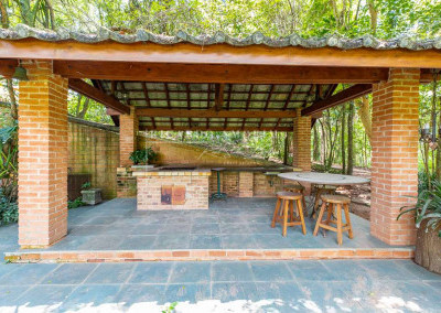 - Anexo Gourmet no jardim integrado à piscina, com churrasqueira, bancada, pia e um charmoso pátio em baixo das árvores.