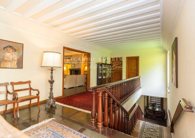 - Escada de alvenaria revestida de madeira com guarda corpo em madeira trabalhada.
