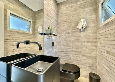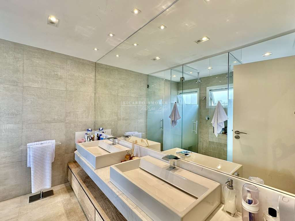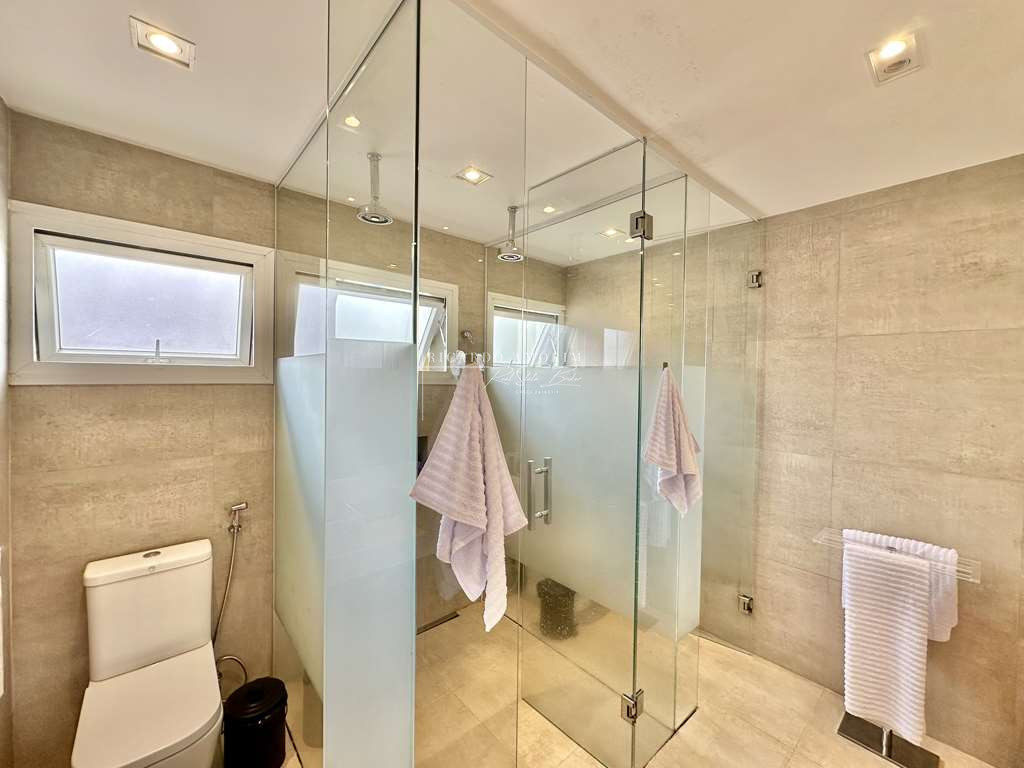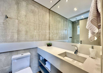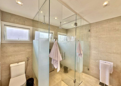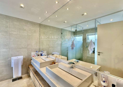 - Banheiros com espelhos, gabinetes com gavetões, bancada, box de vidro até o teto, nichos e chuveiros de teto. Sendo a master com tampo em mármore, 2 cubas, 2 duchas de teto e 2 vasos separados.