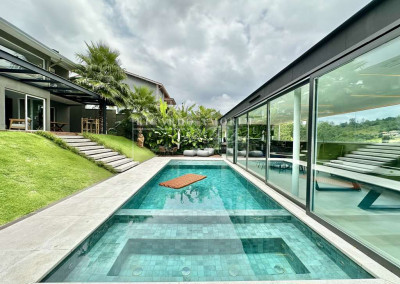 - Piscina de alvenaria 10 m x 4 m, aquecida solar, hidro SPA para 10 pessoas, prainha, cascata e solarium, com piso atérmico anti-derrapante.