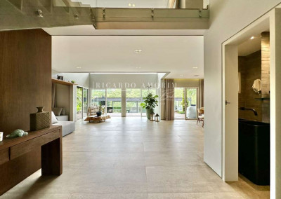 - Hall de entrada social com pé direito alto, porta pivotante imponente e fechadura eletrônica Yale.