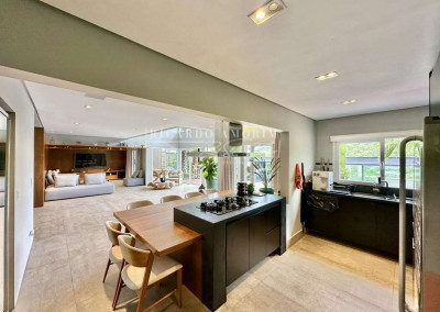 - Cozinha integrada ao living com um grande e confortável balcão, em ilha, ideal para almoço, café e aperitivo. Fogão 5 bocas com coifa, bancada em “L”, com 2 cubas inox. Forno, micro, máquina de lavar, tudo Brastemp e grande despensa.