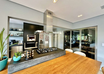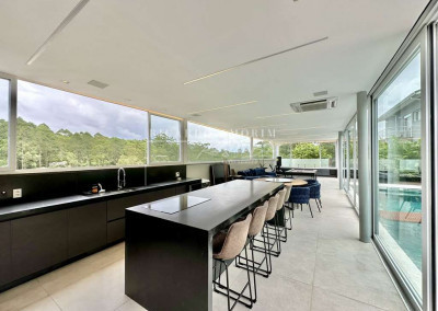 - ANEXO GOURMET / SALAÕ DE FESTAS MULTIUSO envidraçado com grandes portas de correr. Ideal para festas, jogos, academia e música, com ar condicionado de teto, projetor, churrasqueira em inox e vidro, coifa inox, bancada em “L” com pia inox, armários, gabinetes planejados e frigobar. Ilha grande com bancada para 6 lugares, gabinetes, fogão de indução, forno, pia.