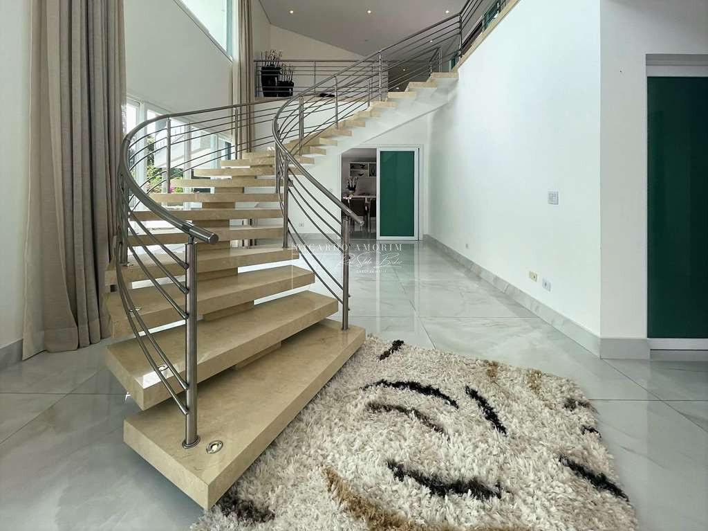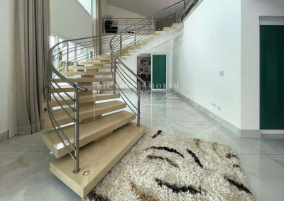 - Linda escada iluminada, suspensa com movimento circular e revestida em mármore Crema com guarda corpo em inox.