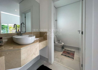 - Lavabo com lavatório externo e tampo em mármore Crema.
