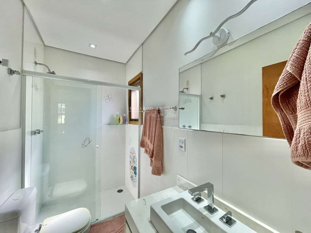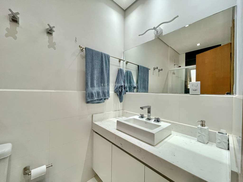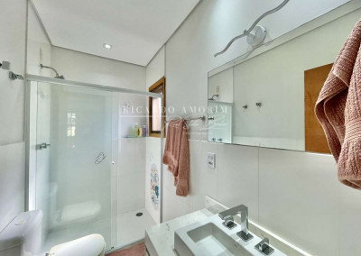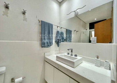 - Banheiros com tampos em mármore, espelhos, gabinetes, box de vidro e nichos, sendo a master com hidro dupla.