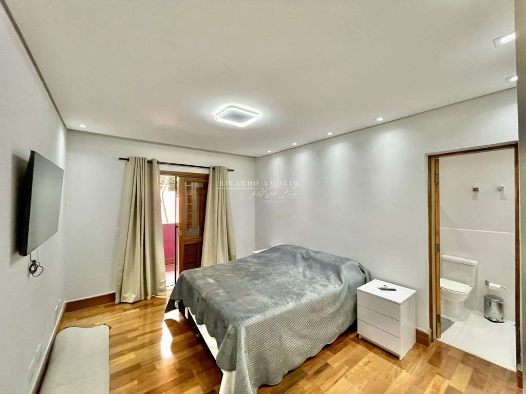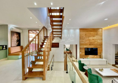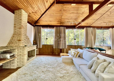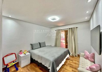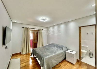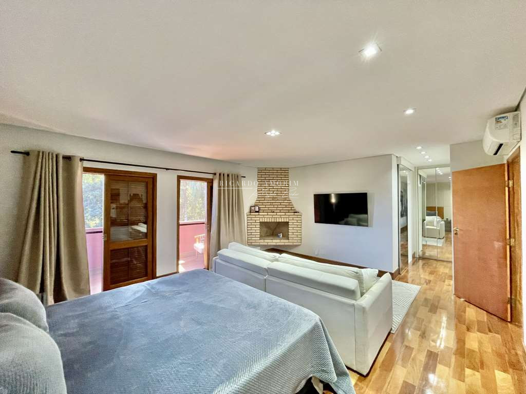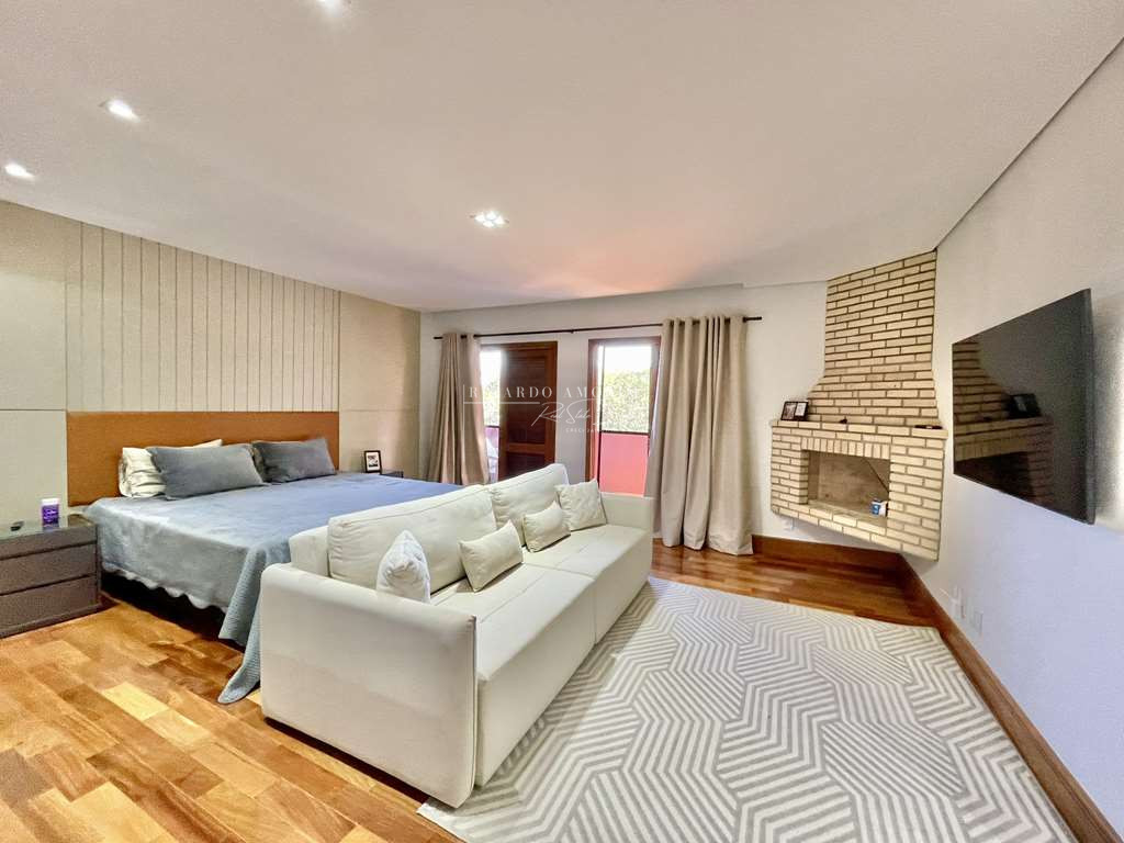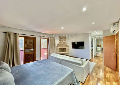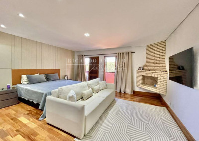 - 4 suítes, sendo 3 suítes internas com ar condicionado Q e F e armários, sendo a master com saleta, lareira, closet e varanda.