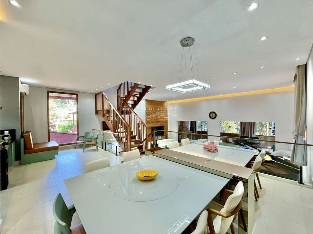 - Jantar com espelho, bar, estar, TV e lareira com 2 bancadas.