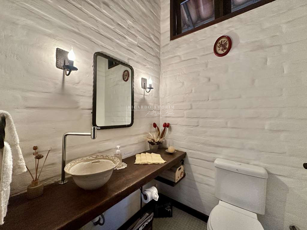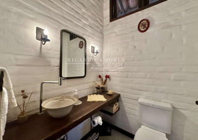- Lavabo com tampo de madeira maciça rústica e pia exclusiva em cerâmica artesanal.