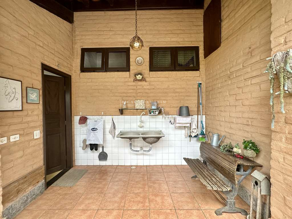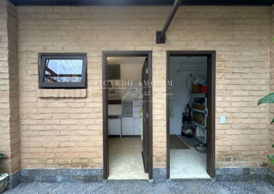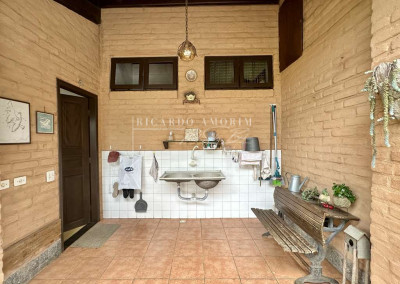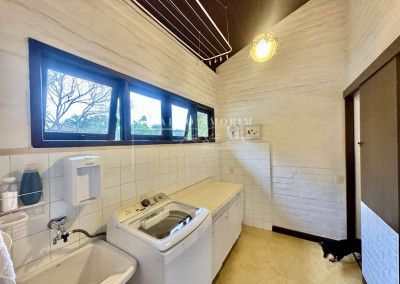 - Área de serviço aberta ensolarada, com 2 tanques externos e lavanderia fechada com 1 tanque, bancada, gabinetes e máquina de lavar.