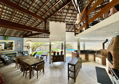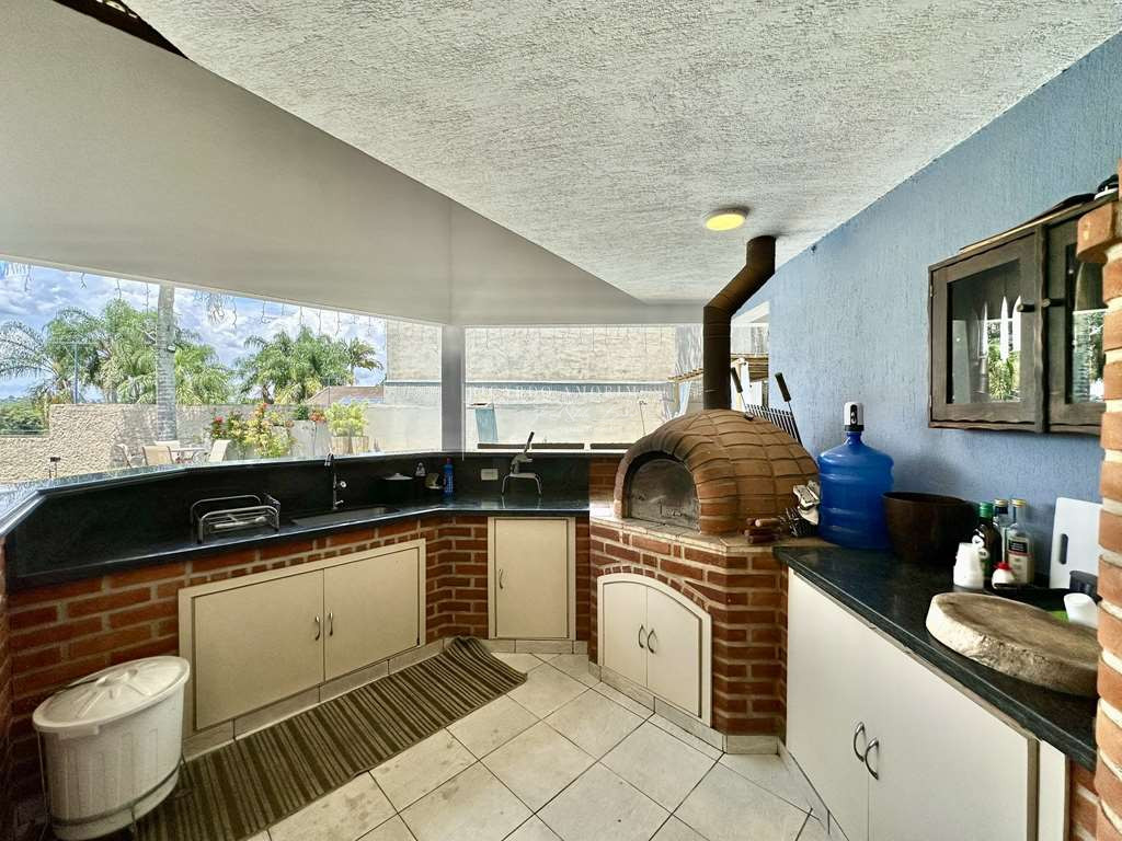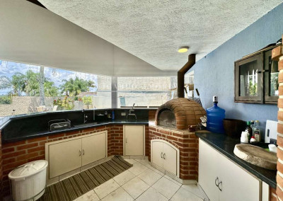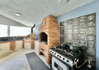 - Área gourmet com balcão, tampo em granito, cuba inox, forno e fogão à lenha, forno de pizza, churrasqueira e gabinetes.