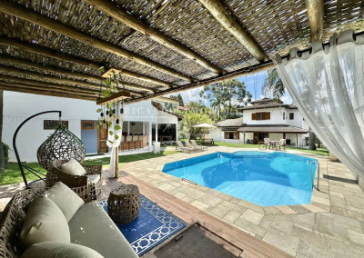 - Piscina em formato irregular 8m x 4,5m, escada interna com corrimão, prainha, hidro e cascata.