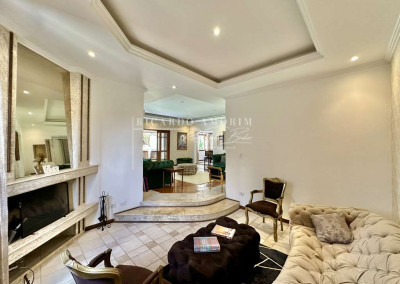 - Estar, bar, jantar com bay window e lareira em desnível com escada em Travertino e parede de espelho.