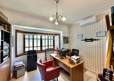 - Escritório (térreo) com ar-condicionado, janela bay window, bancadas, estantes e banheiro completo (ideal para suíte de hóspedes).